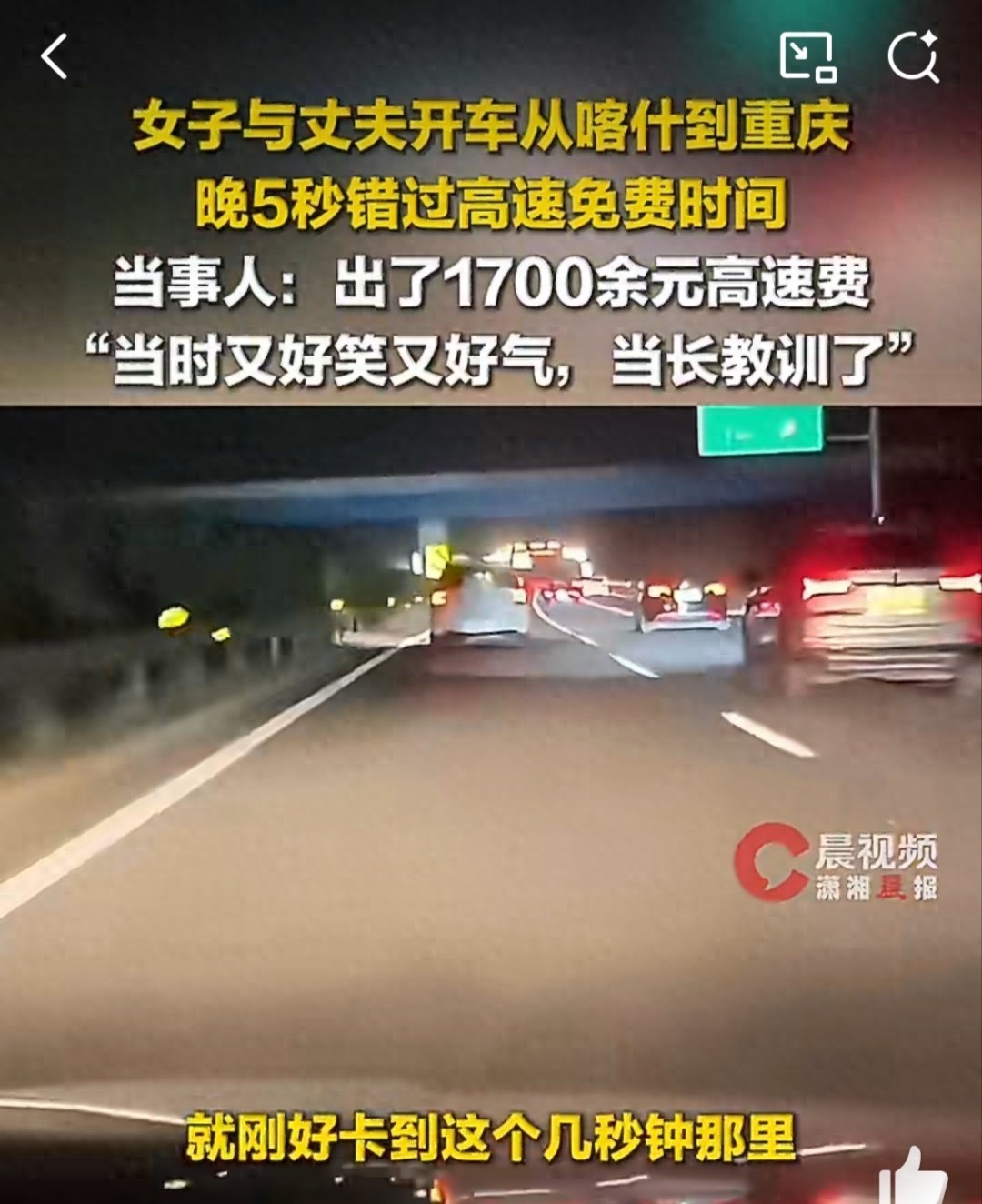 凌晨零点零分零五秒,ETC栏杆静止未动分毫,张姐的一千七百二十四元就这样消失不见了——并非扣费有误,而是从新疆喀什至重庆三千七百公里路程实实在在的路费,只是因为超出了五秒时间,便一分不多一分不少全部掏出支付了。
