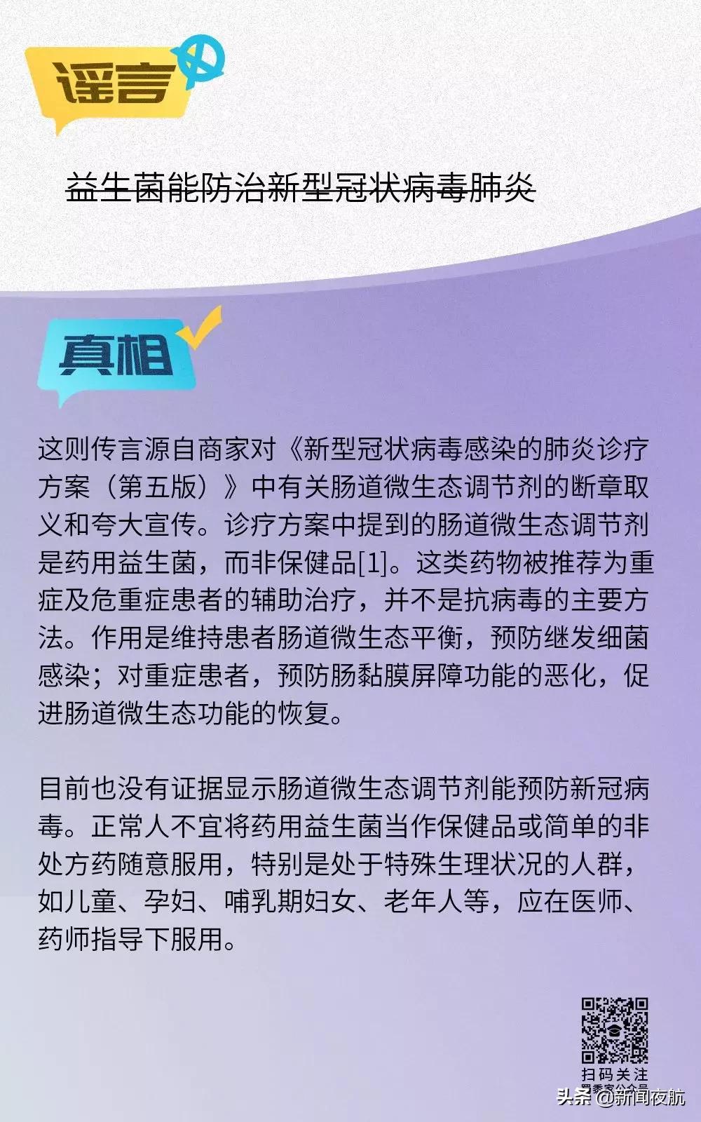 存在这样一种说法,即益生菌能够防治肺炎,然而此说法同样是站不住脚的,因为益生菌主要起到调节肠道菌群的作用,其与呼吸道病毒并无关联。另外,像在口罩里垫纸这种行为,以及把卫生巾当作口罩来使用,这些做法不但没有任何作用,反而很有可能会对口罩结构造成破坏,进而增加被感染的风险。所以对于应对病毒而言,还是应当相信戴口罩、勤洗手这些基本的防护措施。