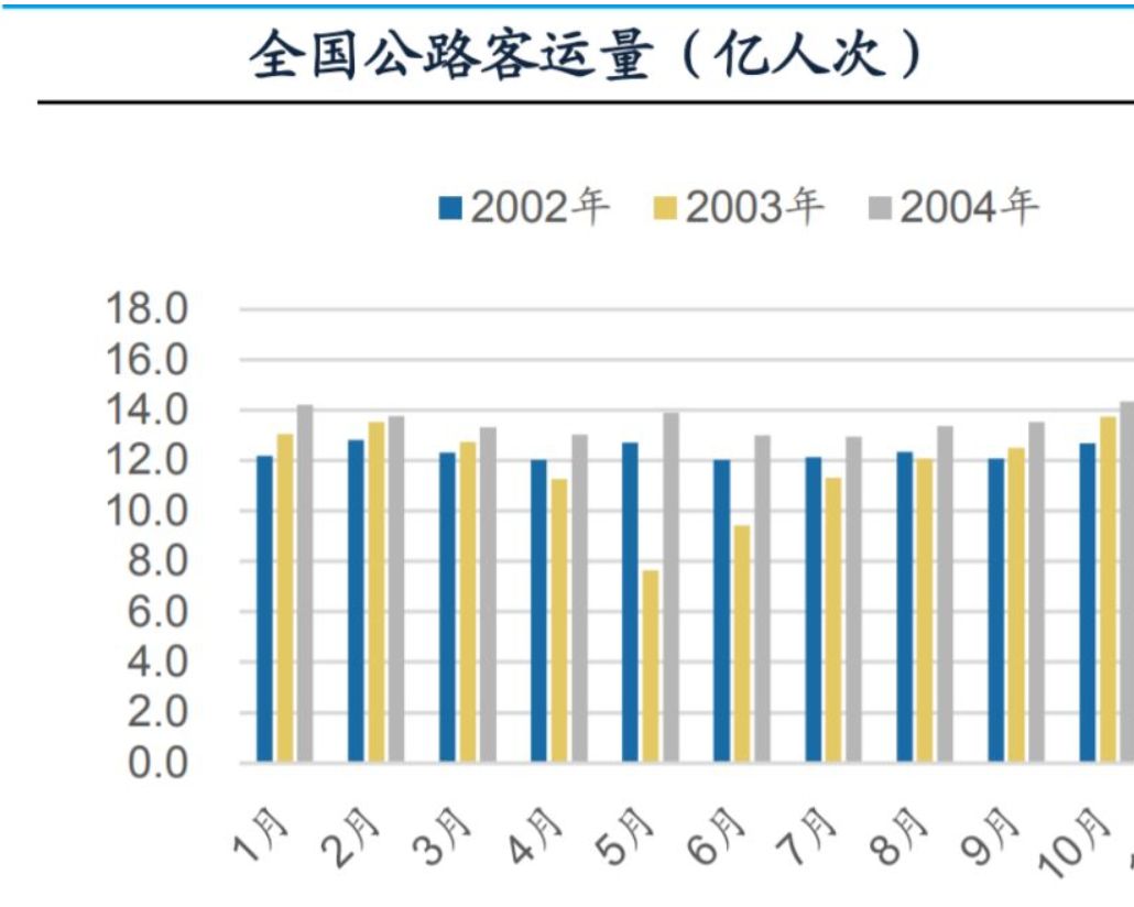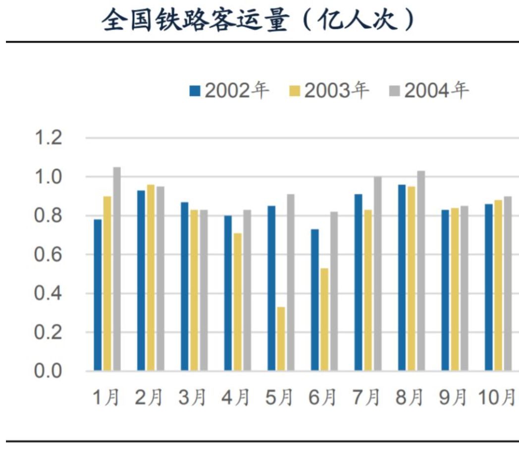 春运本应是交通行业一年里最能盈利的时候,然而今年却变成了最为惨淡的年份,铁路、公路、民航客运量均呈现出断崖式下滑,2020年春运铁路客运量相较于去年同期下降幅度超过60%,这种冲击与2003年非典时期一模一样,那时的交通数据在三到七月间呈V型走向。