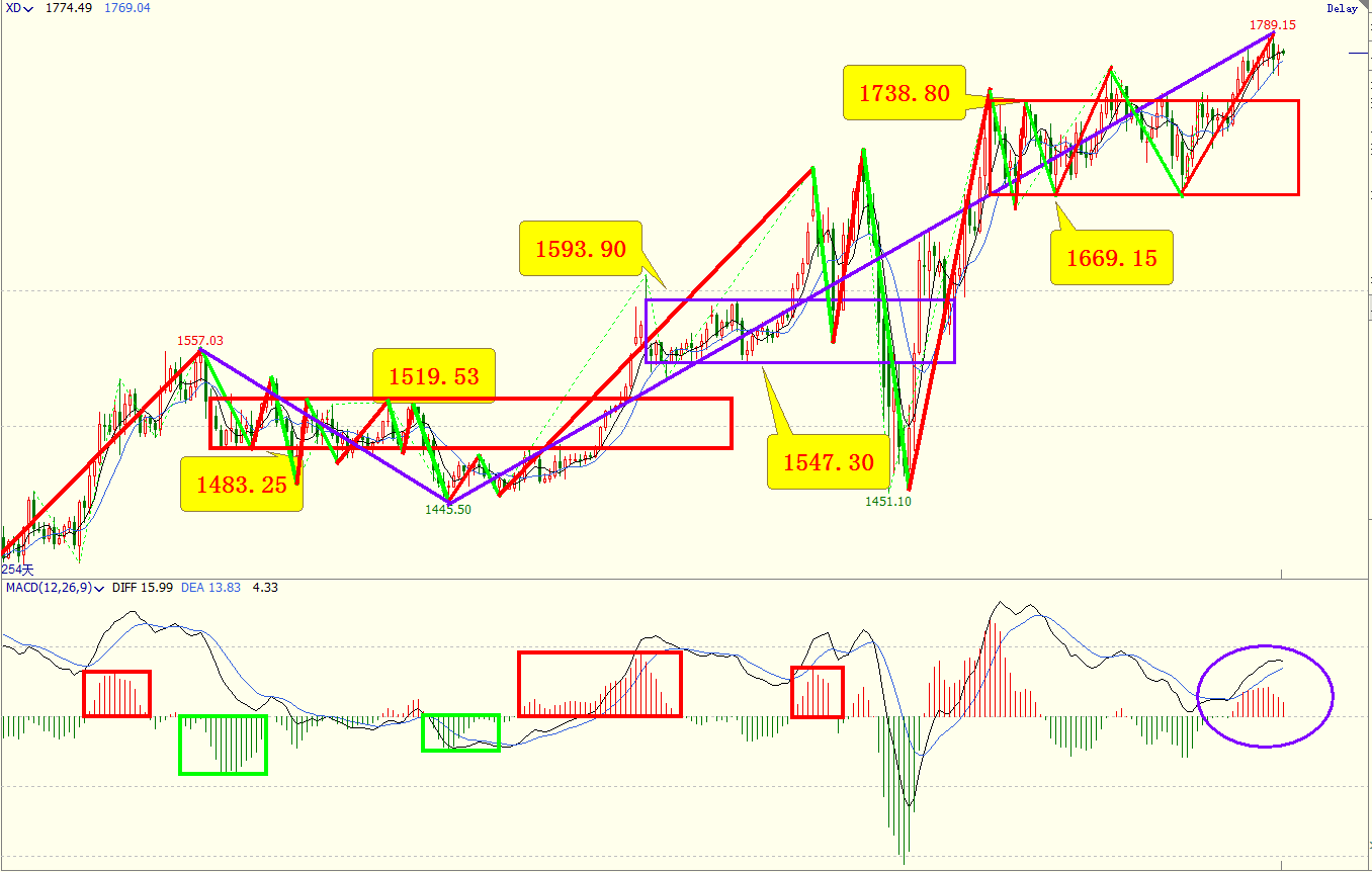从周线的级别层面来观察,国际现货黄金的整体结构依旧保持着多头的态势,然而MACD的指标所对应的红柱和前期比较已然出现了衰减的情况,一旦红柱转变成为绿柱,在技术状况上有可能引发呈现出一轮回调。日线的级别方面同时展现露出类似的信号,在刷新高点之后红柱出现了缩短,回调的预期正在不停积累。