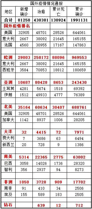 全球疫情在今天又跨越了一个充满惨痛的门槛,其中确诊病例突破了207万例,而死亡人数超过了13.4万例。美国这一个国家的确诊数量就超过了64万,比意大利、法国、西班牙、德国这四个国家的总和还要多,这场在全球范围内的大流行远远没有见到顶峰。