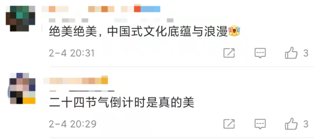 让全球都领会二十四节气,本来是一项繁杂的工程。然而借由倒计时这般的形式,它变得直观且有趣起来。从“随风潜入夜,润物细无声”所对应的雨水,到“春雷响,万物长”所对应的惊蛰,每一帧的画面搭配经典古诗,既呈现出中国各处的美景,又普及了农耕文明的时间智慧。外国观众或许一时难以记住全部节气,可肯定能体会到中国人对时间的诗意解读。
