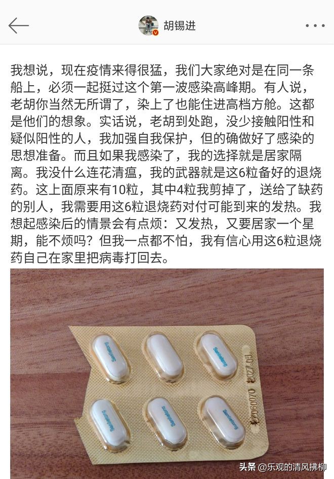 还好有友人适时给他送去了药,好些网友揣测这个友人是不是胡锡进,因老胡才讲自己预备了十粒退烧药,送出四粒给友人,两位知名媒体人都身处北京,相互帮助也实属平常。