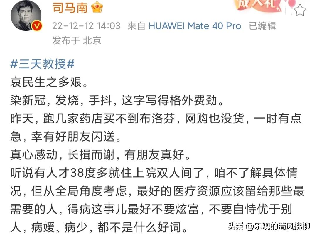 跟别的人将康复之后才去分享不一样,司马南在刚刚被确诊,症状仍旧十分显著的时候就公布了消息,他宣称自己浑身上下都酸痛,还发烧,喉咙尤其难受,然而脑子反倒格外清醒,思考问题相较于平日更加明晰。