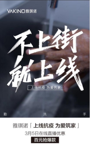 雅琪诺于2020年3月开展线上看工厂以及在线直播优惠活动,使得客户无需出门就能知晓产品生产线,并且能够在线抢购爆款,这般举措既为经销商进行了蓄客,又让消费者在疫情结束后可第一时间到店实现转化。