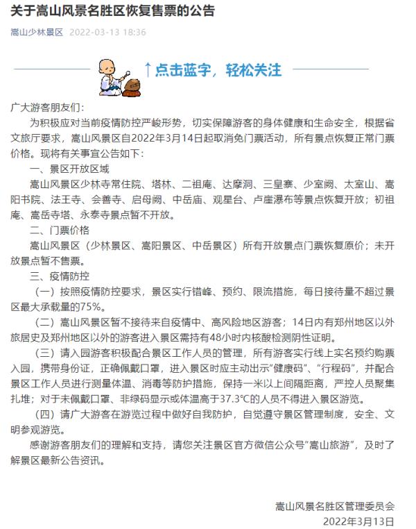 成为旅游大市的洛阳以及焦作反应最为快速,洛阳市方面,龙门石窟、老君山、鸡冠洞、白云山等十多家景区,于3月13日晚间依次发布公告,宣称免票活动提前终止。焦作市的云台山、青天河、陈家沟、影视城等7家主要景区同样取消免票,恢复平常门票价格。这些景区的工作人员连夜调节售票系统,更换园区公告牌,保证3月14日开园前达成所有调整工作,防止游客抵达现场后引发纠纷。