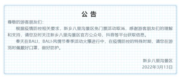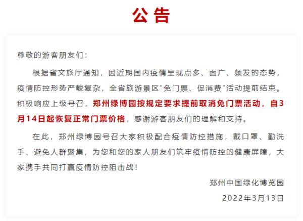 原定持续至3月底的河南景区免门票活动,于3月14日被紧急叫停,此前2月15日,河南宣布226家景区参与“豫见春天·惠游老家”活动,对游客施行首道门票免费,然而随着3月13日河南省新增1例确诊病例与15例无症状感染者,疫情防控形势陡然紧张,嵩山风景区、郑州园博园、洛阳龙门石窟等百余家景区连夜发布公告,自3月14日起取消免门票活动,恢复正常票价。这场原本被期许着用以激发旅游消费的,具有惠民性质的活动,只因疫情出现反弹,所以提前了半个月终止。