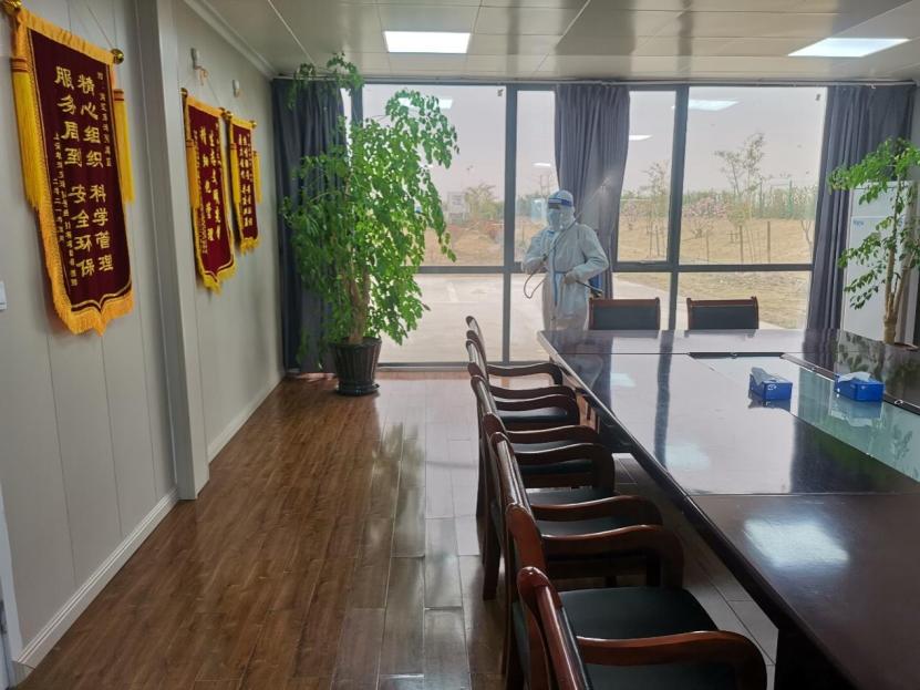 市分类中心四楼的会议室,每天傍晚6点时候会准时进行关门消杀的操作,其中,负责维护清洁的人员会使用超低容量喷雾器来处理空气,在过了半小时后会打开窗户进行通风,工作人员工位上的键盘以及鼠标,改用75%酒精湿巾进行擦拭,以此取代喷雾方式来防止设备出现短路情况,文件传递柜加装了紫外线灯,夜间会自动进行1小时的消毒,从2月起直至现在已处理往来相关文件3000余份。