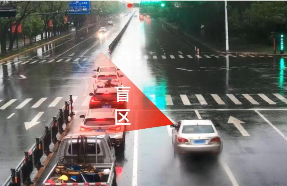 大车车身高大,彻底挡住你的横向视线,你不清楚会有多少人从车头前横穿过马路。处于这种情形下,你务必进行假设会有人突然窜出来,预先降低速度准备刹车,将车速降至能够随时停住的地步,缓这几秒钟时间,换来的乃是安全。