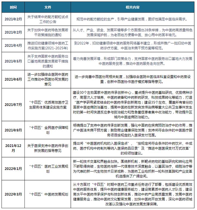 疫情在2020年之后,国家针对中医药的支持政策显著加快速度。和2016年至2020年期间发布的《中医药发展战略规划纲要》等宏观文件相比较,近两年来的政策更着重于具体的执行以及标准的落地。2021年开始以来,国家药监局、中医药管理局等多个部门连续发布文件,涉及中药审评审批的改革、中药材质量的控制、医保支付的倾斜等多个实际操作层面。