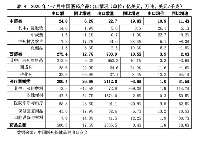 在2020年的时候,中国医药产品出口展现出一种情形,即呈现出“量跌价涨”这样的总体态势,出口的数量微微下降了,然而价值却是上升的。当中,中药材以及保健品的出口额增长得相当明显,这反映出在全球疫情那段时期,对于传统医药和健康产品的关注度有所提升。西药类产品达成了量价齐升的情况。